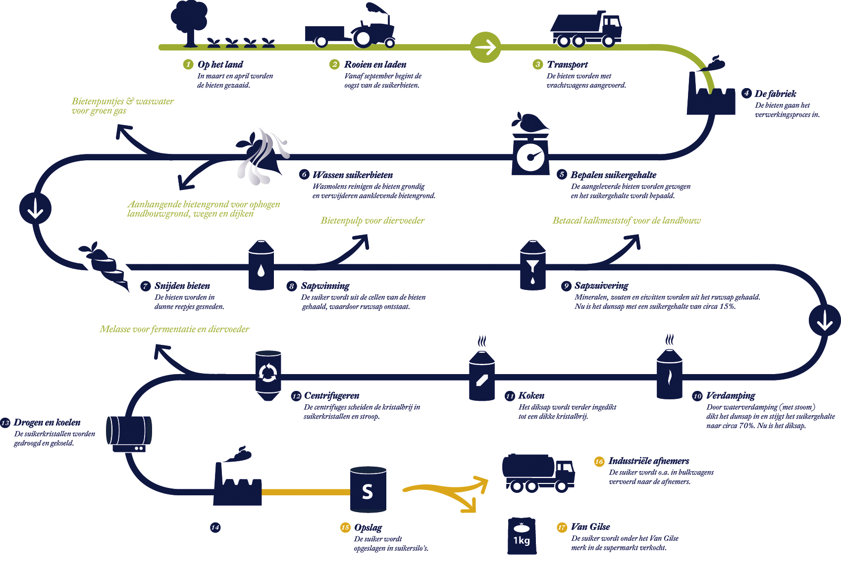 Suiker Unie produceert suiker uit suikerbieten in Nederland. De suikerbiet is het meest efficiënte gewas om in Nederland suiker uit te halen. Zie onze animated infographic over de productie van suiker in Nederland, of bekijk deze infograpic.